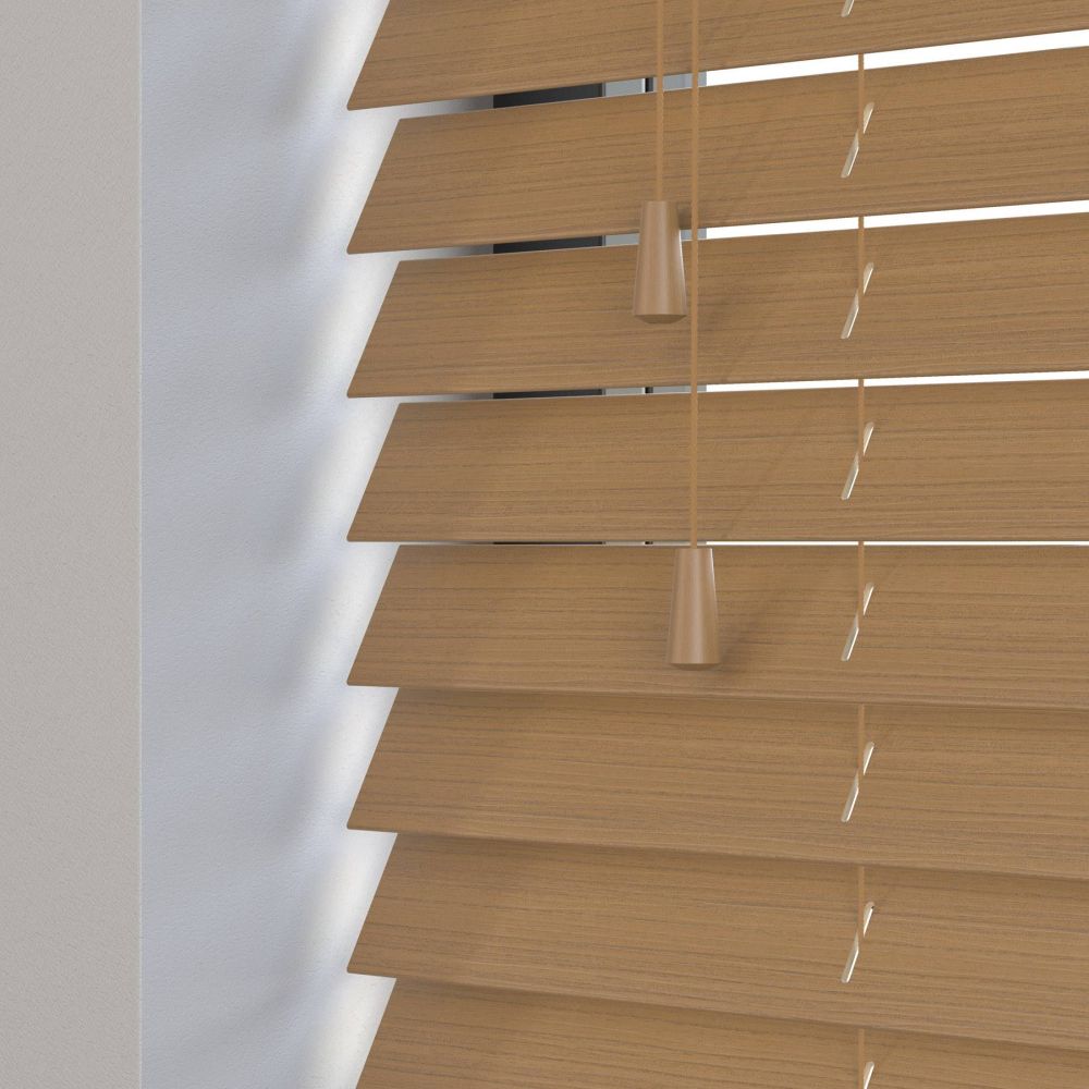 Our wooden and faux wood blinds feature a sturdy, color-coded headrail matching the color of your slats. For blinds with 50mm slats, the headrail dimensions are 42mm in height and 59mm in depth.