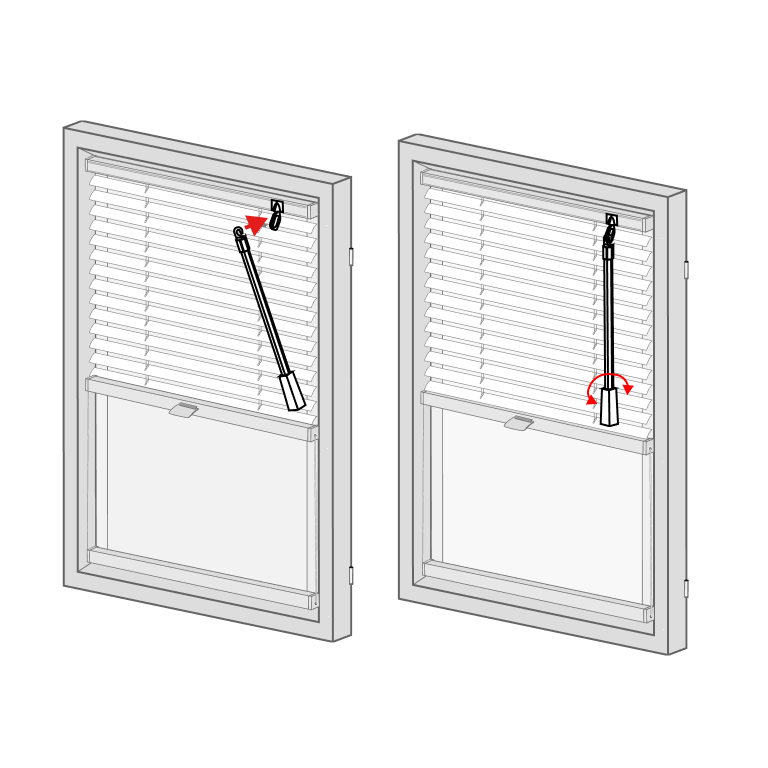 Attach the plastic wand by hooking the wand onto the tilt mechanism on the venetian blind. Twist the wand to open and close the slats.