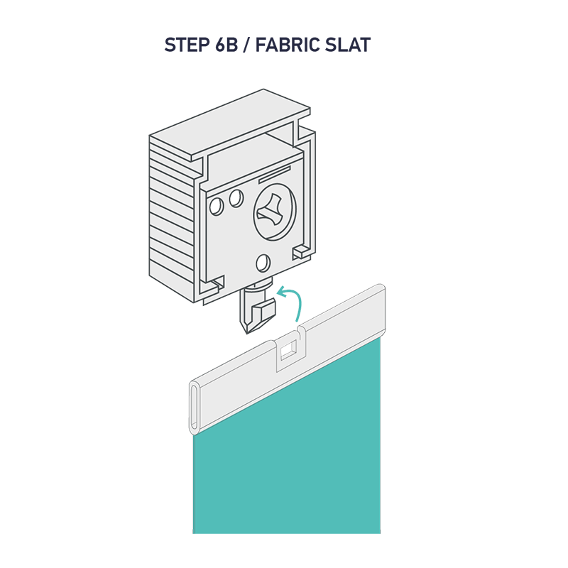 This step applies to the fabric range. You can identify this by the type of headrail traveller and slat fitting provided. Once the headrail is installed, hook each fabric slat into the headrail travellers, ensuring the traveller pegs are in the open position.