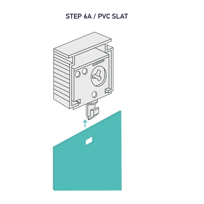 This step applies to the PVC/Waterproof range. The type of headrail traveller and slat fitting provided will help you identify this range. Once the headrail is installed, hook each PVC slat into the headrail travellers, making sure the traveller pegs are in the open position.